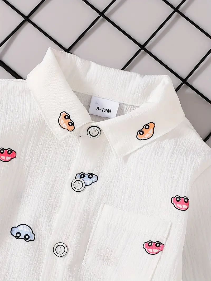 👕✨ Elegante camisa blanca con estampados de dibujos animados para niños 👶🎨. Presenta divertidos patrones pequeños 😄🖼️, lindos y llamativos 🌟🐻 que capturan la atención 👀 y reflejan la alegría infantil 🎈🎉. Ideal para ocasiones especiales 🎂📸 o para dar un toque original y moderno 🌈🆒 al look diario de los más pequeños 🧒👧.