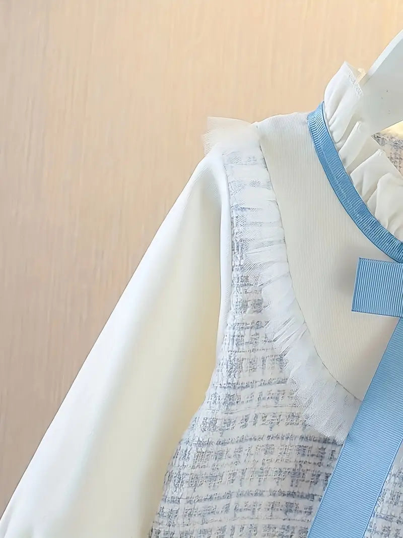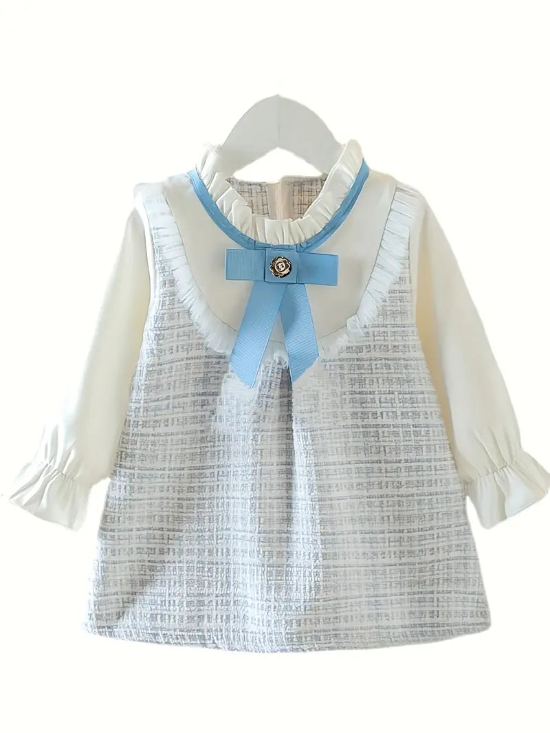 👗 Vestido elegante de manga larga para niña, con estampado de cuadros celeste y blanco 💙🤍, cuello con volantes 🎀 y detalle de moño 🎀, holgado, lavable a máquina 🧼🌀, ideal para todas las estaciones ☀️🍂❄️🌸.